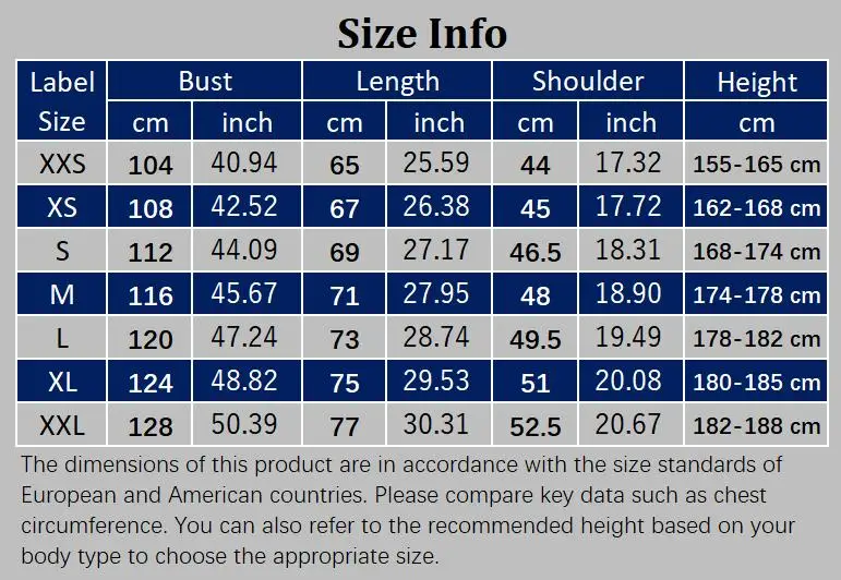 The dimensions of this product are in accordance with the size standards of European and American countries. Please compare key data such as chest circumference. You can also refer to the recommended height based on your body type to choose the appropriate size.
